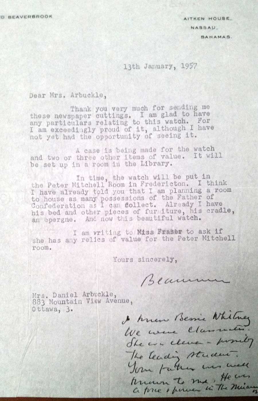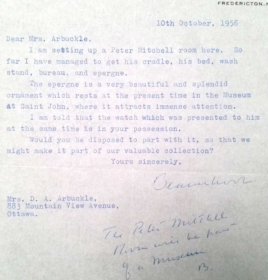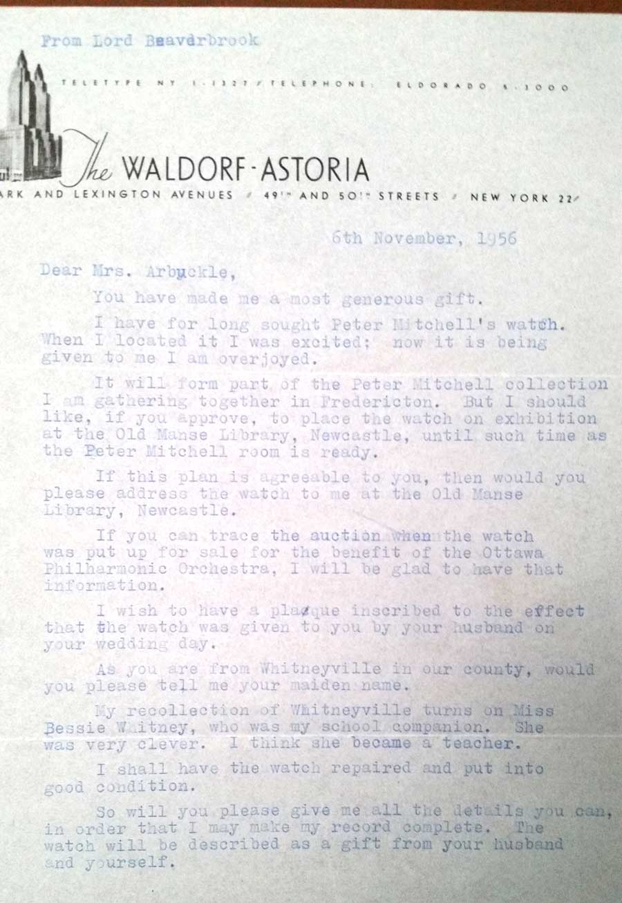 I can't tell you how pleased I am that you've given this handsome and historic watch to his Lordship. It will be kept in the Peter Mitchell room, which he is furnishing, and will be part of the memorial to one of Miramichi's greatest patriots. It is a blessing it was saved from a melting pot, it almost seems like a miracle. And I particularly admire your generosity in making this gift, which is prized for its associations, as well as for its historic and intrinsic value. Lord Beaverbrook was much touched.