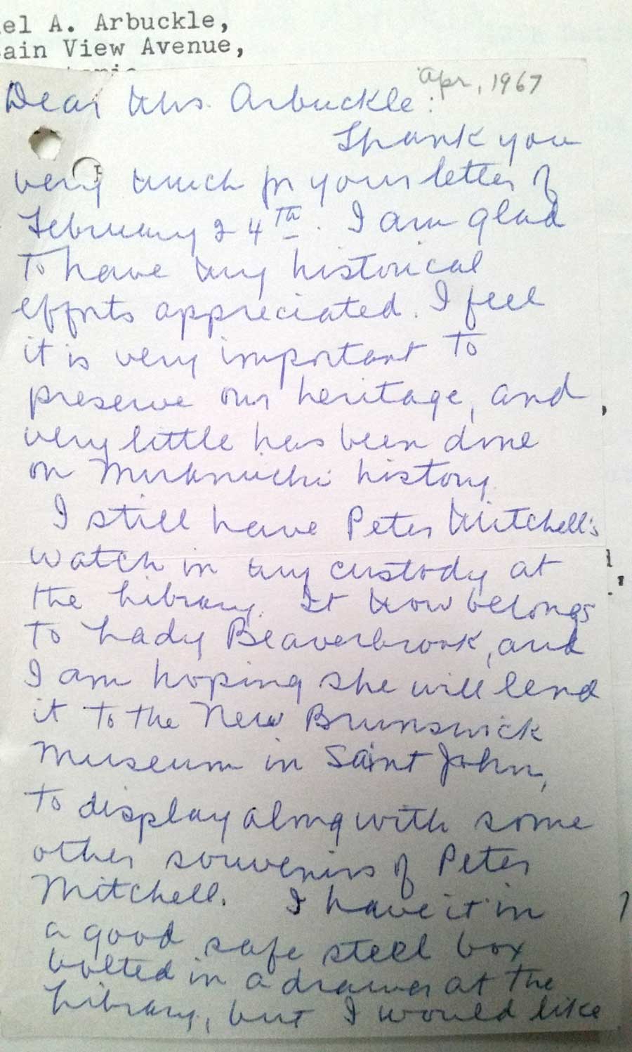 It will form part of the Peter Mitchell collection I'm gathering together in Fredericton. But I should like, if you approve, to place the watch on exhibition at the old manse library, Newcastle, until such time as the Peter Mitchell room is ready.