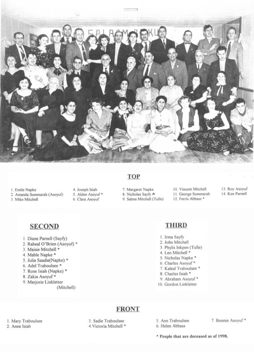 Some Lebanese families that came to Miramichi are Linkletter, Mitchell, Asoyuf, Traboulsee, Napke, Isaiah, Abbass and Sayfy. Pictured above is a photo taken in 1955 at the Seaman’s Hospital of a gathering of Lebanese families. See the photo and legend below.